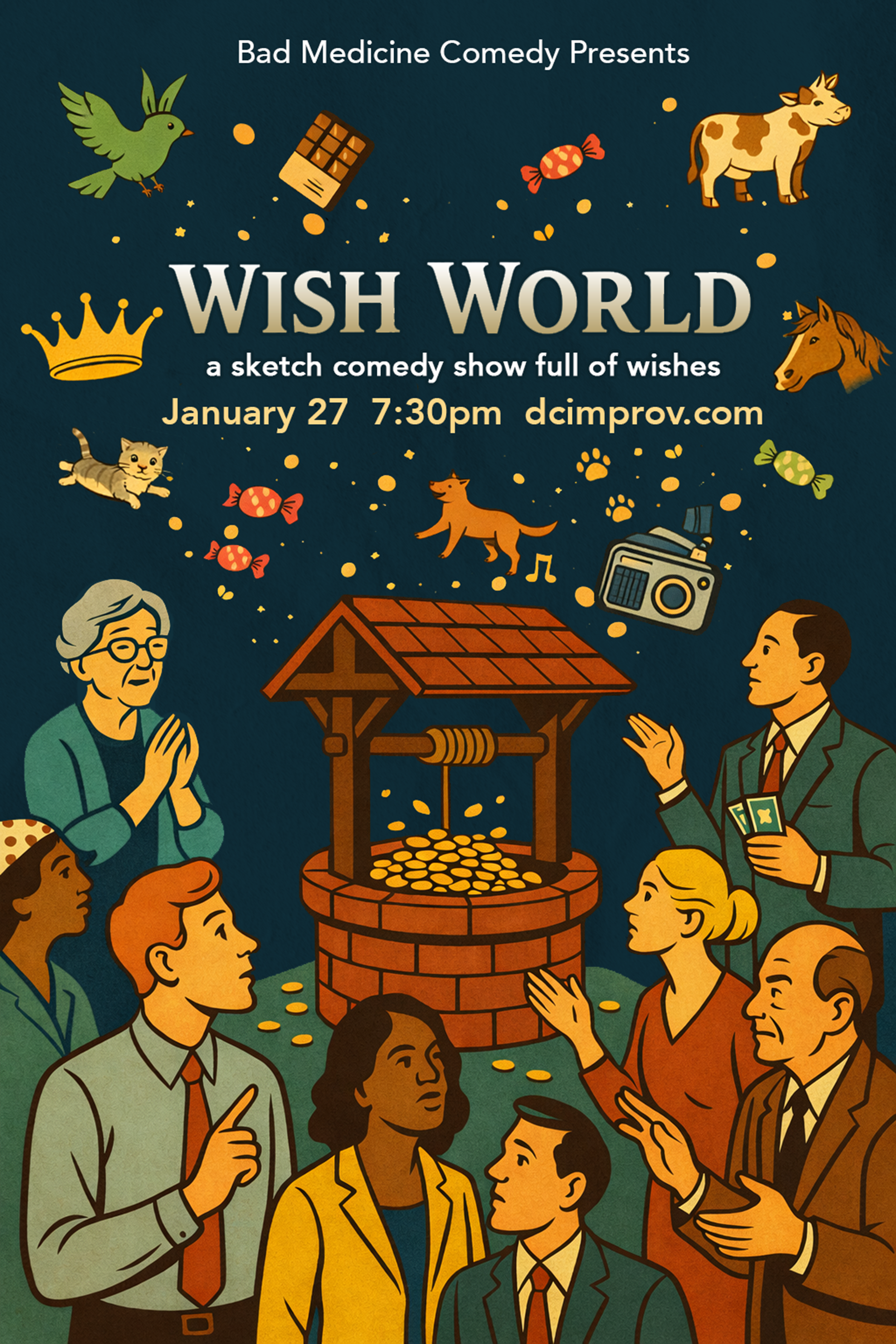 Bad Medicine has answered your wish. You know the one where you wished for a topsy turvy, ensemble movie-inspired sketch comedy show focused on wishes coming true? Oh, good. On March 17 at DC Improv, Bad Medicine presents Wish World: a sketch comedy show full of wishes gone well and awry. You’ll laugh so hard you may even forget to always be careful what you wish for. See you on Tuesday, March 17th at 7:30pm (Doors: 6:15). Purchase your tickets at dcimprov.com